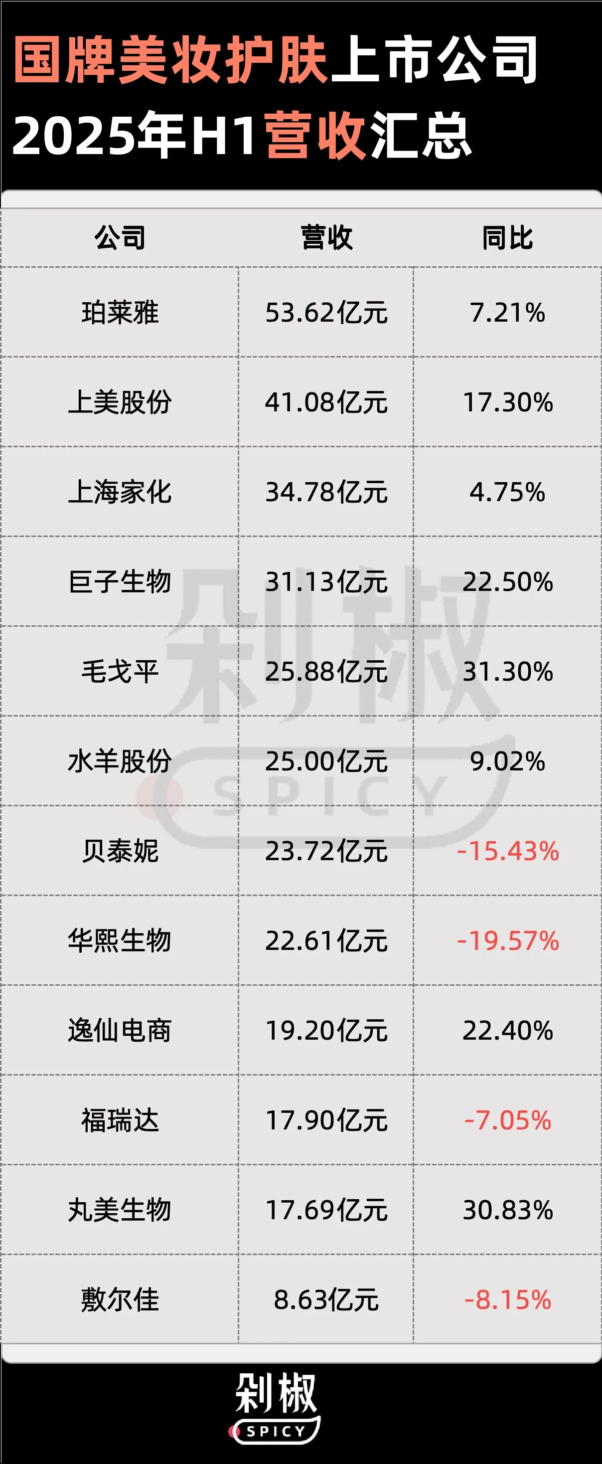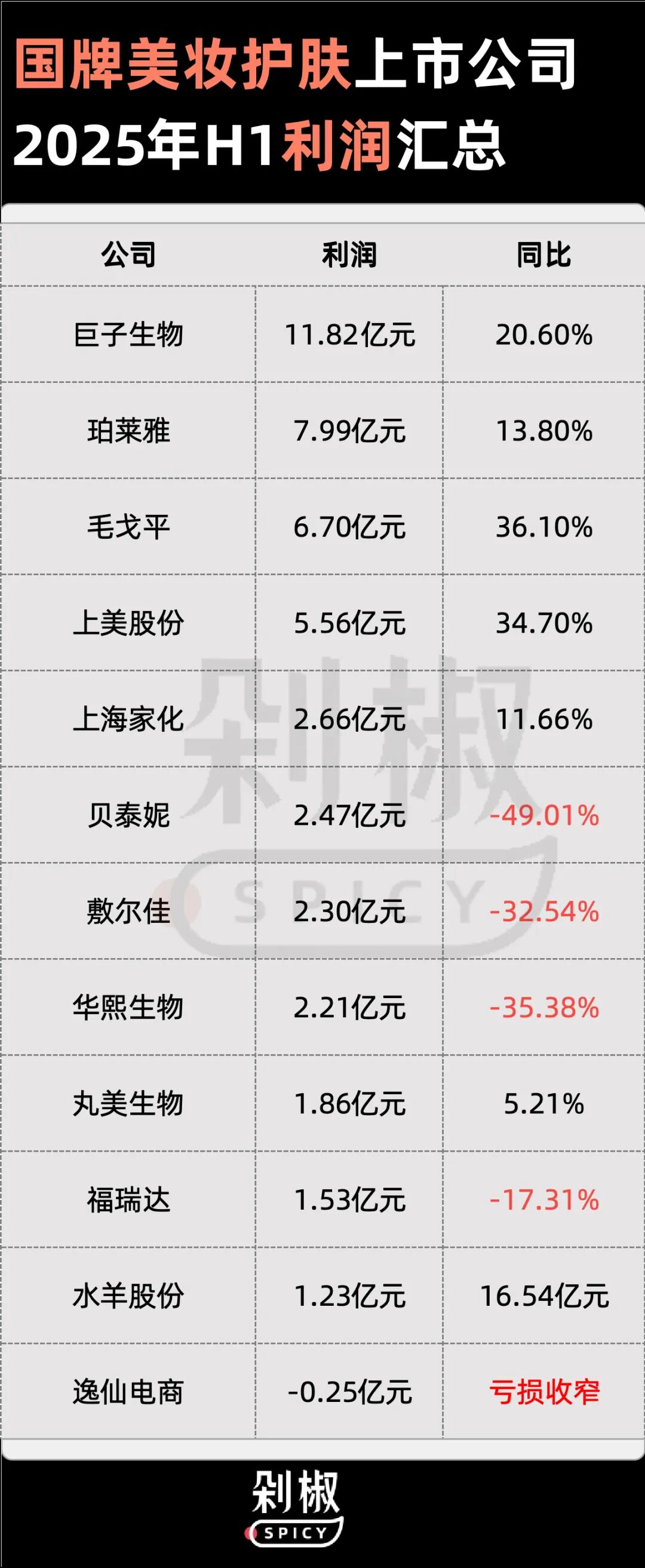 近期,备受存眷的国产美妆护肤企业陆续宣布2025年上半年财政事迹。从事迹层面来看,总体格式相对于不变,珀莱雅及上美股分仍稳稳盘踞着行业老年夜、老二的位置,巨擘生物的利润依旧遥遥领先,华熙生物、福瑞达、贝泰妮等老牌企业,暂未从动荡中脱身,事迹亮红灯。