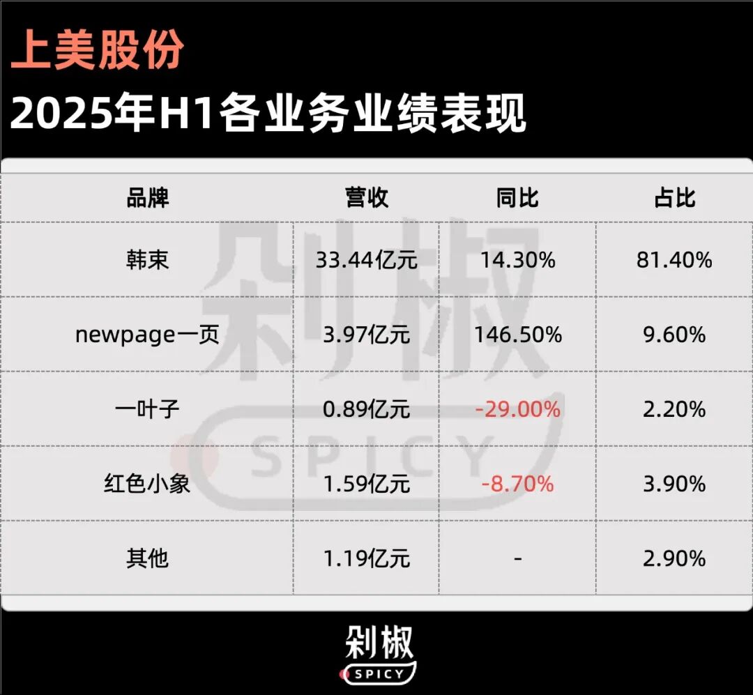 不外上美今朝的多品牌计谋,还有没有阐扬出指望中的势能。其子品牌中除了了newpage一页连结着较快的增加,一叶子及红色小象均有差别水平的下滑,且主品牌韩束仍盘踞着超8成的营收。